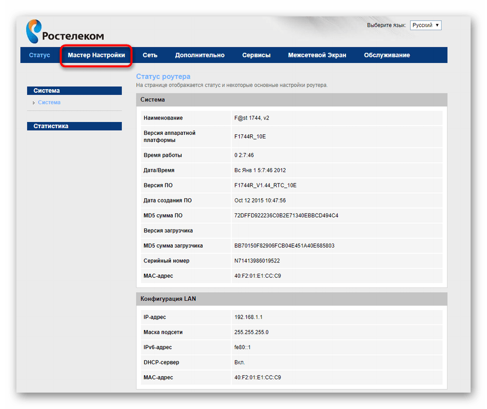 Провайдер Ростелеком подключает клиентов к сети через WAN-кабель, однако использует для этого весьма противоречивый протокол PPPoE. Его недостаток заключается в том, что для доступа к интернету юзеру придется вручную прописывать полученные уникальные авторизационные данные в веб-интерфейсе маршрутизатора. Мы разберем этот процесс на примере фирменного оборудования F@st, если оно у вас другое, ищите похожие названия разделов и пунктов либо же воспользуйтесь поиском на нашем сайте, чтобы отыскать отдельную статью по настройке роутера от конкретной фирмы. Существует два варианта возможного конфигурирования. Первый заключается в использовании Мастера и выглядит так:
