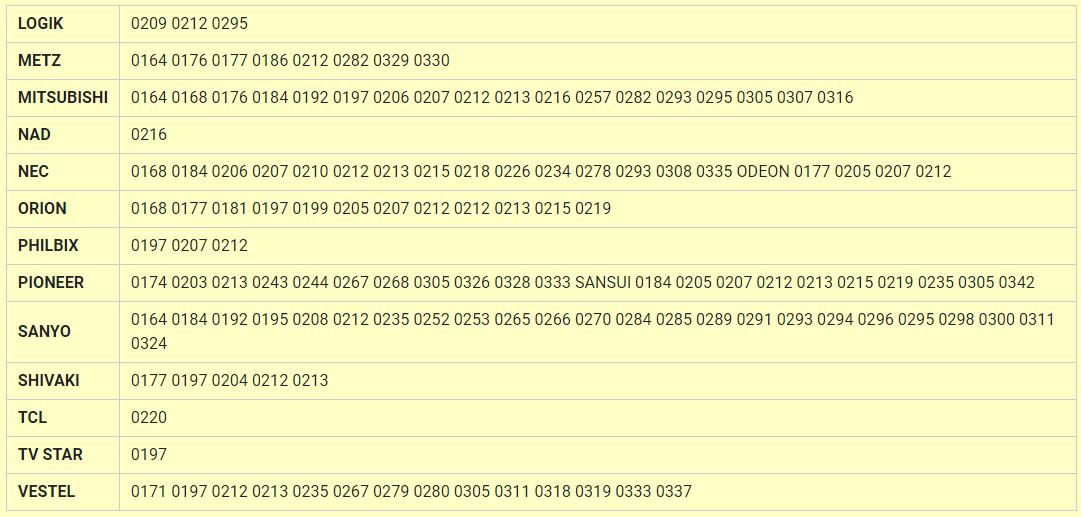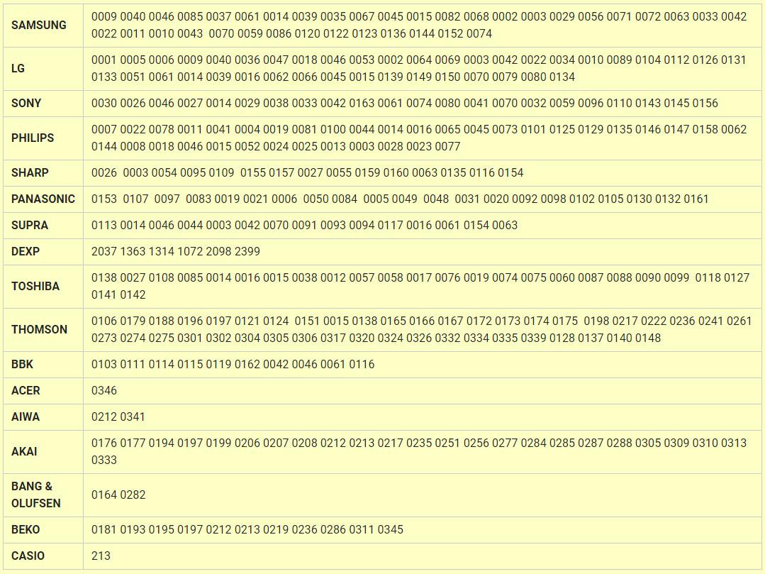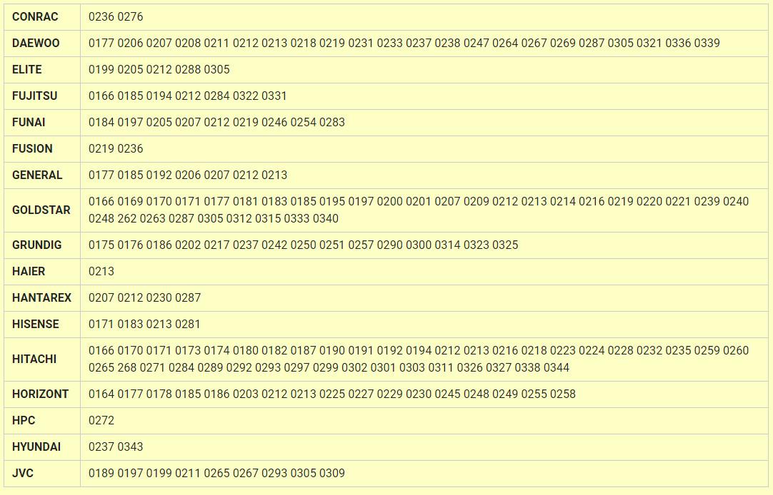 3. Найдите в таблице код для своего телевизора и наберите его.