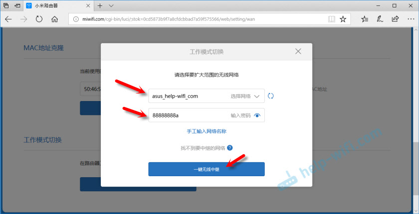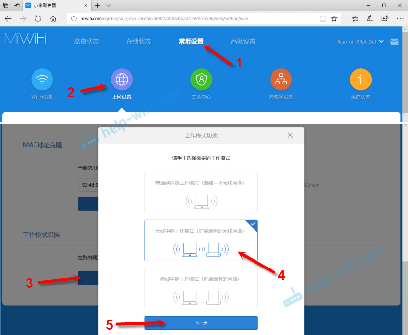 Можно обойтись без сброса настроек и повторной настройки маршрутизатора с выбором нового режима работы. Достаточно просто открыть web-интерфейс по адресу miwifi.com (192.168.31.1) и в разделе «Common settings» (буду указывать названия на английском) – «Internet settings» в самом низу нажать на кнопку в разделе «Work mode switch». Выбрать режим работы «Wireless relay working mode (extend the existing wireless network)» (Ретранслятор).
