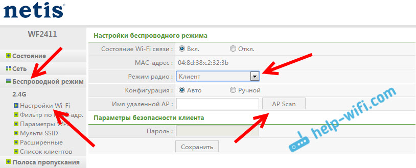 Все очень просто. В настройках, в которые можно зайти по адресу netis.cc переходим в расширенные настройки нажав на большую кнопку Advanced и сразу переходим на вкладку «Беспроводной режим» – «Настройки Wi-Fi». В выпадающем меню «Режим радио» выберите «Клиент». Нажмите на кнопку «AP Scan».