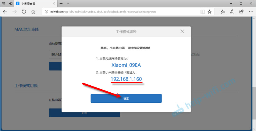 Появится окно, где будет указано имя Wi-Fi сети которую будет транслировать роутер и IP-адрес, по которому можно зайти в настройки роутера (в режиме повторителя).