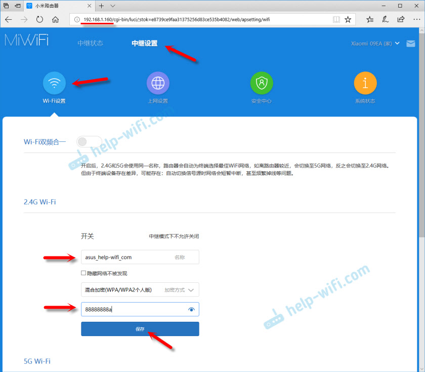 И в настройках задайте такое же имя и пароль как у вашей главной Wi-Fi сети. В том числе для диапазона 5 ГГц. Только для него имя лучше задать другое.