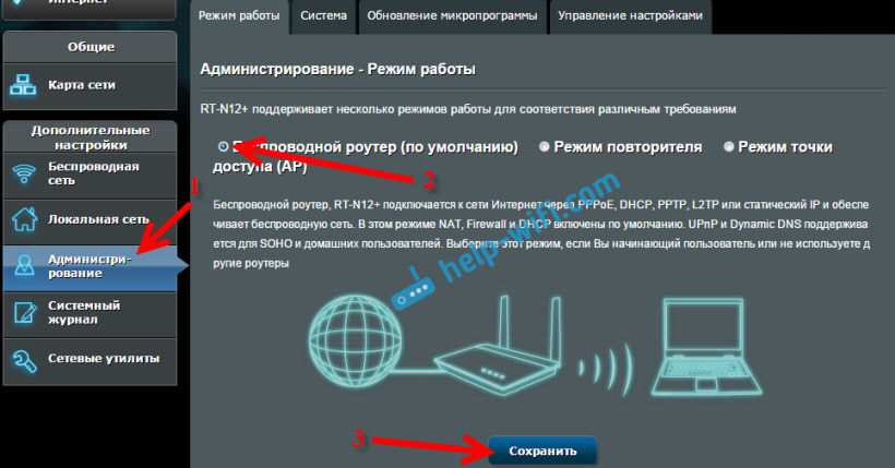 Если вам роутер понадобился для использования по его прямому назначению, то достаточно в настройках, на той же вкладке Администрирование выбрать режим работы Беспроводной роутер (по умолчанию), и нажать кнопку Сохранить.