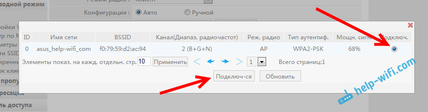 Дальше все стандартно. Нужно выбрать беспроводную сеть, сигнал которой нужно усилить. И указать пароль для подключения к этой сети.