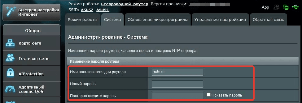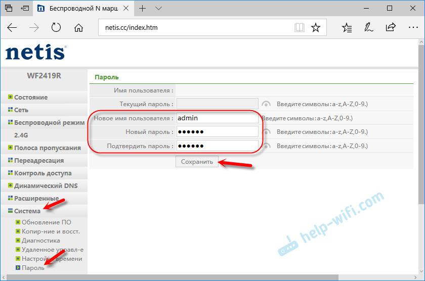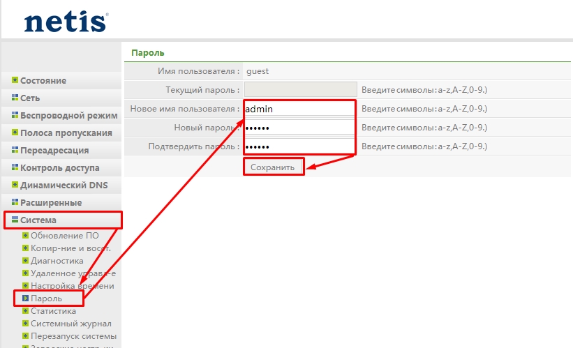 Перейдите в раздел «Система» — «Пароль». Введите свое имя пользователя (например, admin) и дважды введите пароль. Обязательно запишите свой пароль, чтобы потом не пришлось его восстанавливать.