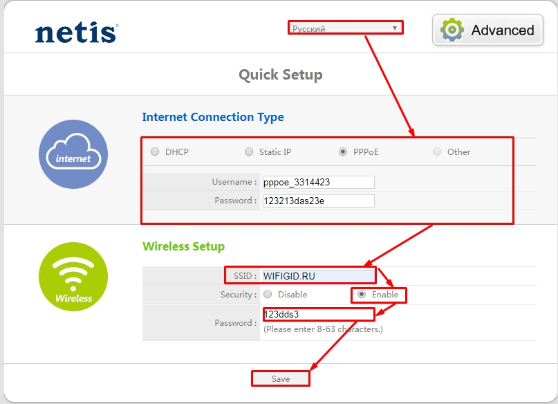 Сохраните настройки, нажав на кнопку «Сохранить». Все будет сохранено без перезагрузки. Появится сеть с новым именем (если вы его сменили). Для подключения к которой нужно использовать установленный пароль. Интернет через Netis уже должен работать. Если не работает, значит заходим в настройки и проверяем подключение.