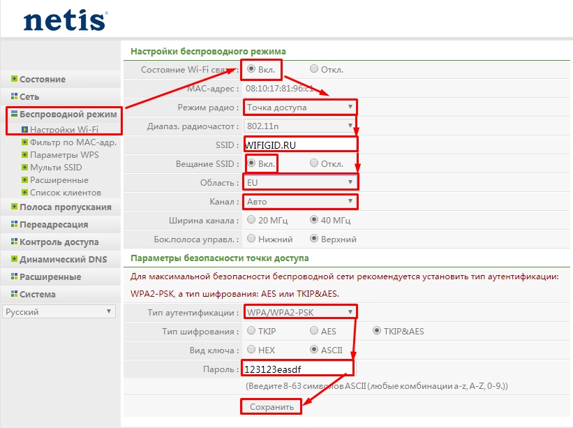 Для детальной настройки вайфай переходим в «Беспроводной режим» – «Насатройки Wi-Fi». Включаем сеть и устанавливаем в режим «Точка доступа». Я установил диапазон радиочастот в режим «802.11n», но если у вас есть старые устройства, то ставим «802.11b+g+n». Вписываем имя сети включаем вещание SSID. Область лучше установить как «EU», а канал в режим «Авто».