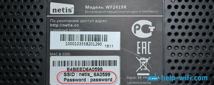 Заводское название сети, пароль и адрес для входа в настройки указаны снизу роутера Netis WF2419R или Netis WF2419.