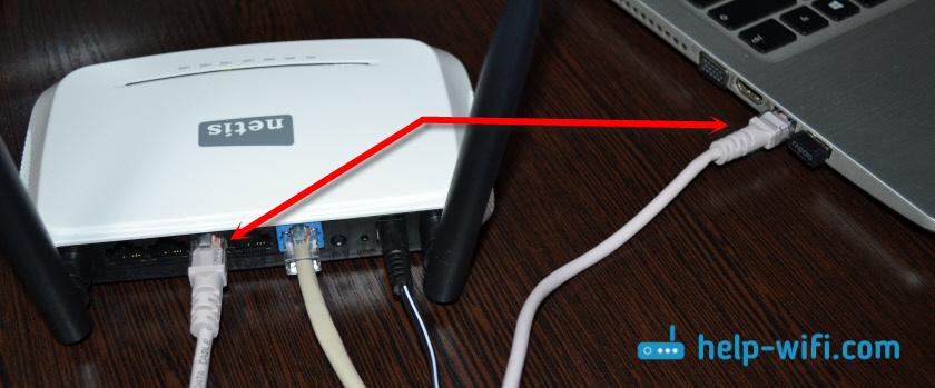 Дальше нужно подключится к роутеру с устройства, через которое вы планируете проводить настройку. Если у вас есть компьютер, или ноутбук с LAN портом, то лучше использовать его. С помощью кабеля, который идет в комплекте, соедините компьютер с Netis.