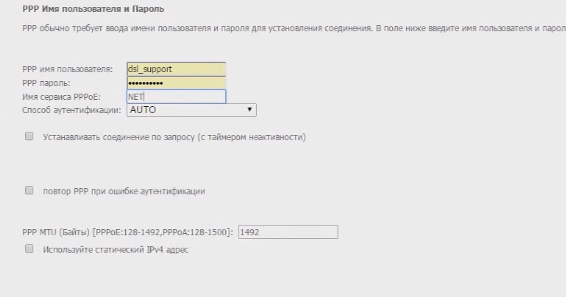 - Тут потребуется указать слой логин и пароль, который провайдер передавал вам при подключении своих услуг.