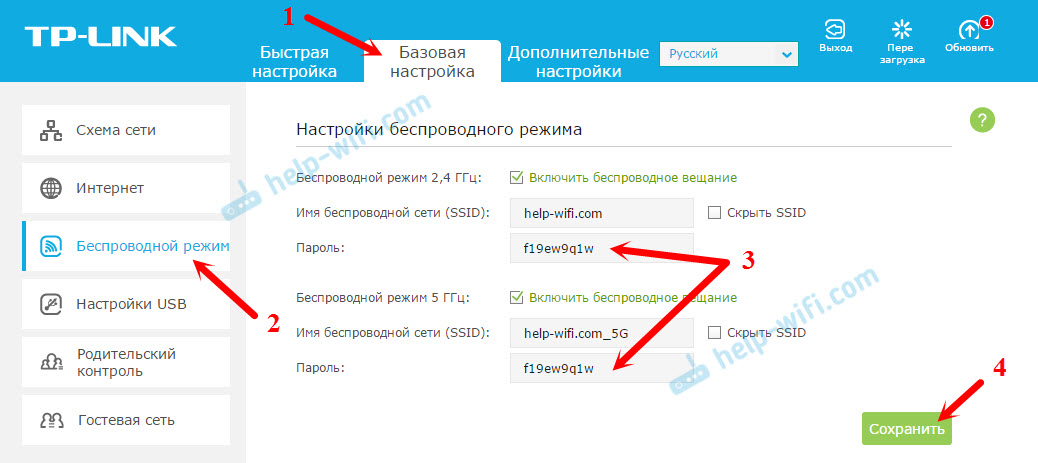 Обратите внимание, если у вас двухдиапазонный роутер, который раздает две Wi-Fi сети на частоте 2.4 ГГц и 5 ГГц, то пароль нужно устанавливать для обеих сетей. Он может быть одинаковым, или разным