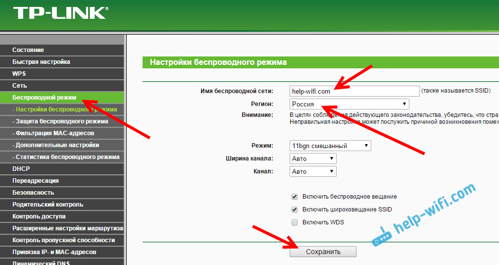 В панели управления открываем вкладку Беспроводной режим. Придумайте название для своей Wi-Fi сети, и запишите его в поле Имя сети. Если хотите, можете оставить стандартное имя. Дальше, в меню Регион выберите свой регион, и нажмите на кнопку Сохранить.