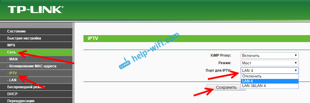 В большинстве случаев, достаточно выбрать режим Мост, и указать в какой LAN разъем вы хотите подключить STB-приставку. Если же вам нужно настроить IPTV с указанием VLAN ID, то нужно в меню Режим выбрать 802.1Q Tag VLAN.