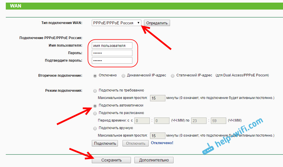 Достаточно выбрать PPPoE, указать имя пользователя и пароль, выставить обязательно автоматическое подключение, и сохранить настройки.