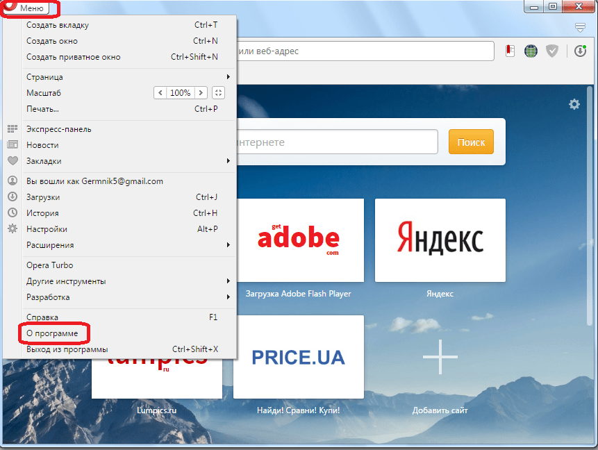 Поэтому, вполне резонно, самые важные данные скопировать на носитель, а потом, после переустановки браузера, вернуть их на место. Таким образом, можно также сохранить настройки Оперы при переустановке системы Windows в целом. Все основные данные Opera хранятся в профиле. Адрес профиля может отличаться, в зависимости от версии операционной системы, и пользовательских настроек. Чтобы узнать адрес профиля, переходим через меню браузера в раздел «О программе».