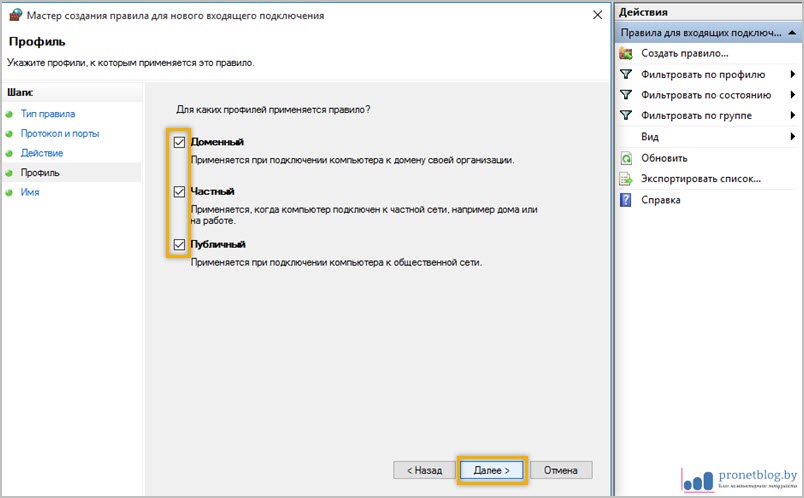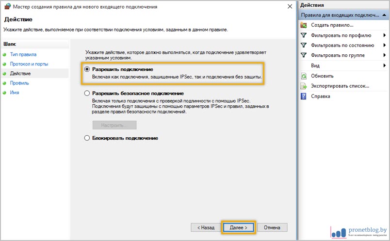 Только будьте очень внимательными при настройке выбора действия. Почему-то изначально брандмауэр предлагает “Блокировать подключение”. Это нам не нужно, поэтому ставим галочку напротив пункта “Разрешить подключение”.