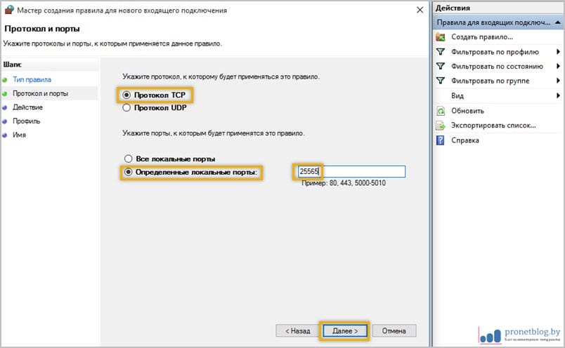 Выбираем необходимый протокол. В большинстве случаев это TCP. Указываем локальный порт, для которого мы ранее настраивали проброс порта на маршрутизаторе. Можно задавать сразу несколько портов через запятую или диапазон через “-“.