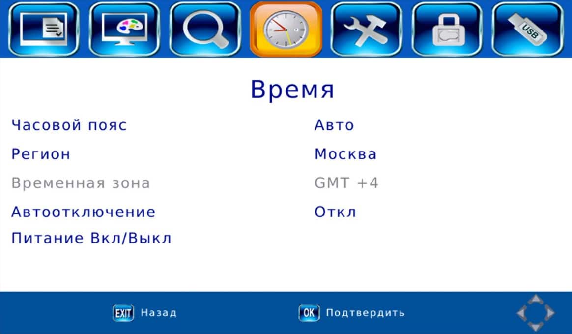 Данную настройку следует выполнить как на телевизоре, так и умной приставке. Только в таком случае интернет будет работать стабильно, да и в целом будет комфортно смотреть ТВ. Например, на телевизоре DEXP нужно перейти в «Меню» — «Функции» — «Часы».