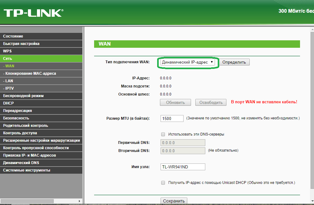 - В админ-панели следует выбрать «Динамический IP», если подключен кабель LAN непосредственно от ранее настроенного роутера к TL-R480T+. Он будет автоматически получать настройки через DHCP. Если напрямую подключается WAN-соединение, такое как PPTP, то нужно сделать соответствующие настройки.