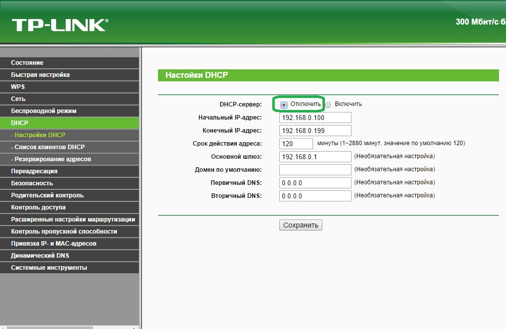 В процессе настройки первым делом необходимо отключить сервер DHCP