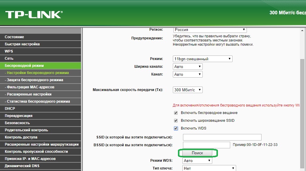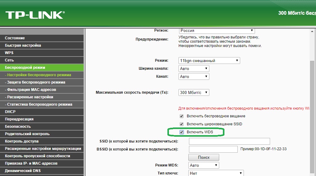 - Отметьте опцию WDS. Без неё создание радиомоста Wi-Fi невозможно.