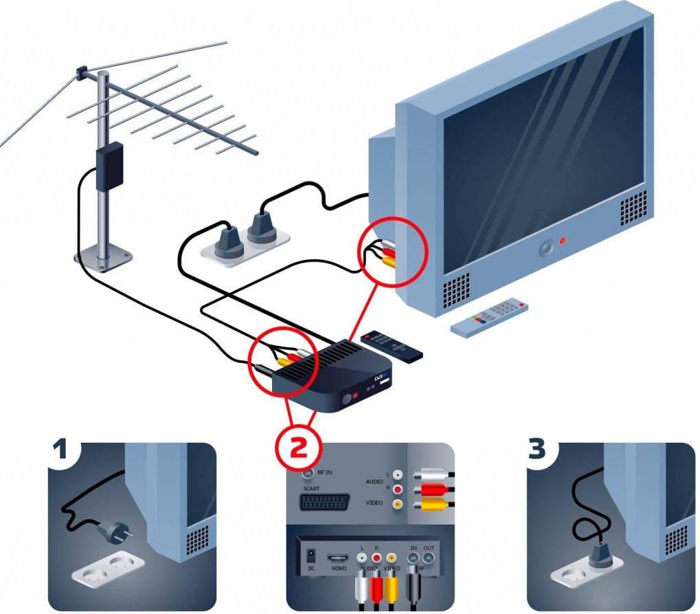 - Подключить приставку к телевизору одним из имеющихся проводов. Это может быть HDMI — кабель, или привычные всем колокольчики, имеющие со второй стороны вход AV.