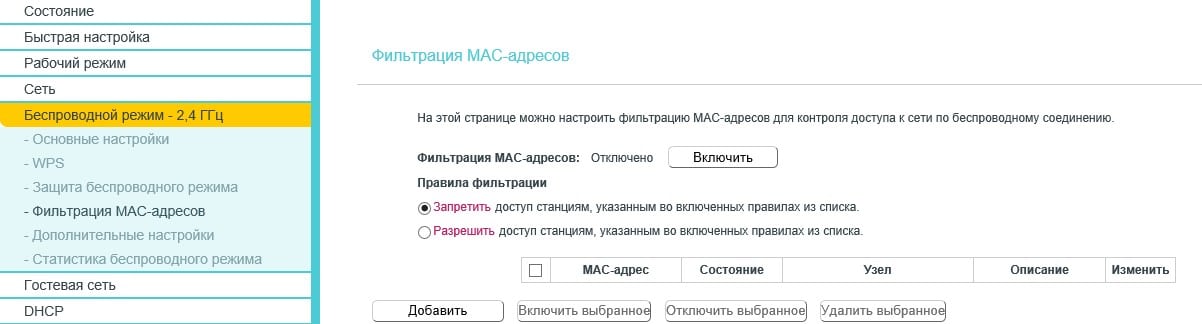 Отключить фильтрацию MAC-адресов. Возможность ограничивать доступ к интернету по уникальному MAC идентификатору есть во всех моделях. Нужно войти в админ-панель и найти вкладку «Фильтрация MAC-адресов». Обычно находится в разделе «Беспроводной режим». Система может быть настроена так, что блокируется подключение с конкретного устройства или со всех девайсов, за исключением тех, которые указаны в списке. Лучше отключить функцию полностью, по крайней мере на время проверки.