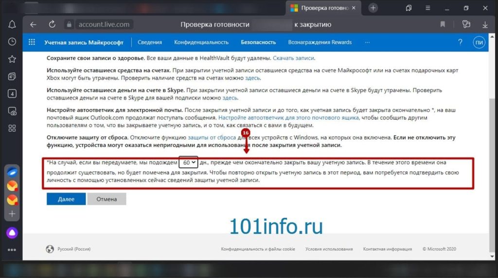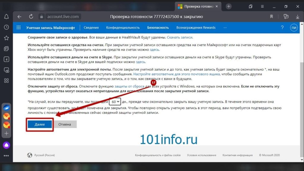 Ознакомиться с информацией на последней странице. Здесь оговаривается возможность отмены решения об удалении аккаунта в течение 60 суток.