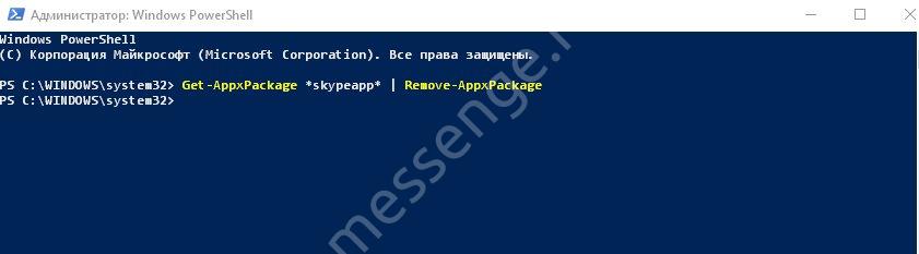 - Вставьте в окно следующую команду «Get-AppxPackage *skypeapp* | Remove-AppxPackage» (без кавычек);