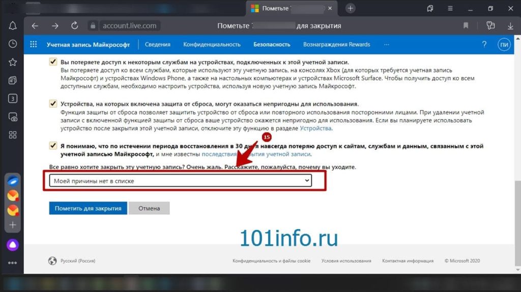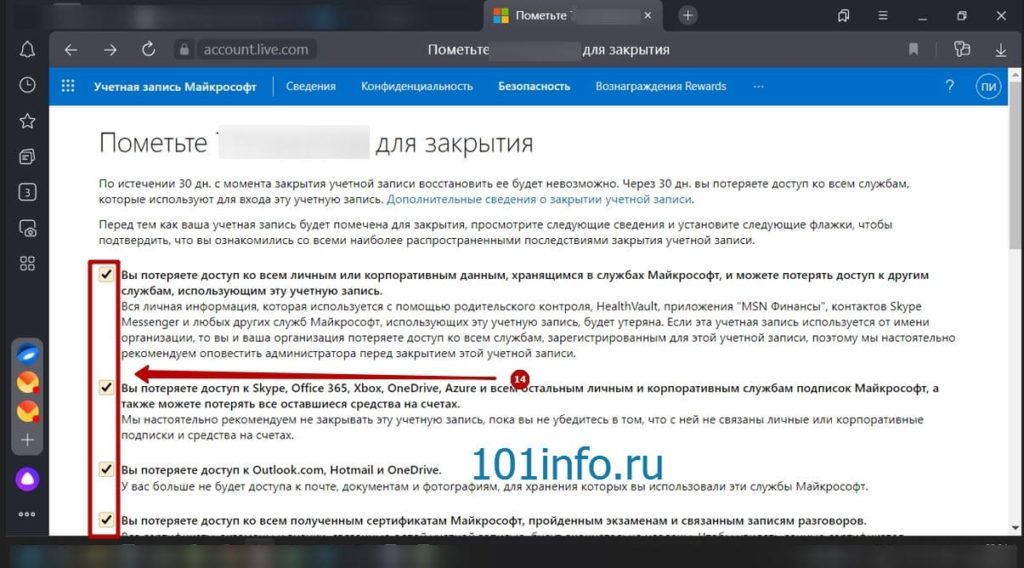 Проставить «птички» около названий сервисов, которые станут недоступными после деактивации аккаунта Скайп. Данная процедура демонстрирует согласие юзера с последствиями, которые повлечет за собой отказ от учетной записи.