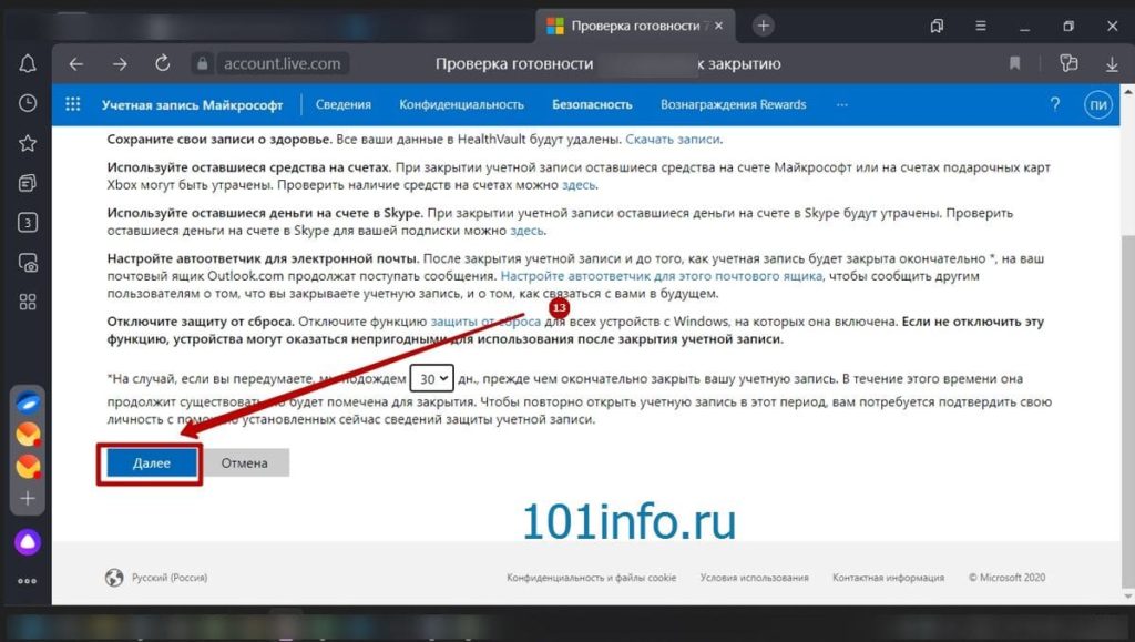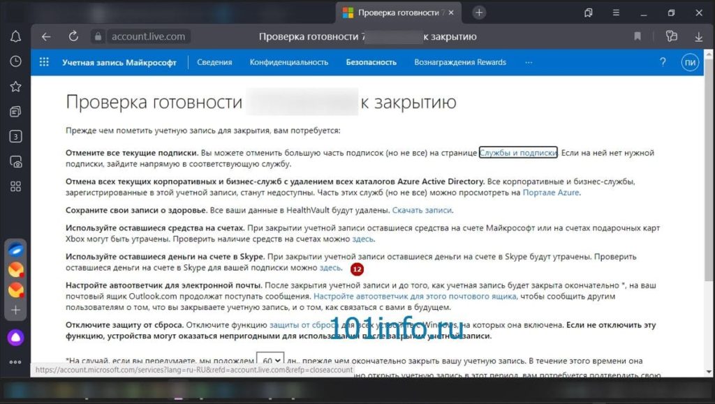Ознакомиться с перечнем действий, которые необходимо выполнить при подготовке к закрытию учетной записи. Пользователь может выполнить весь комплекс рекомендуемых действий или ограничиться отдельными пунктами из списка.