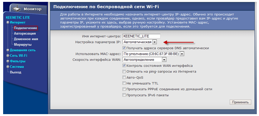 Этот тип подключение, самый простой, и по умолчанию сразу же настроен на роутера. Но некоторое провайдеры привязываются к мак адресу устройства, и за этого если подключить интернет провод к другому устройству интернет работать не будет. Эту проблему можно исправить несколькими путями. Можно позвонить в тех поддержку и попросить что бы они поменяли привязку на другой мак адрес. НО есть и более простой способ, поменять мак адрес роутера на тот который стоит в привязках у провайдера.