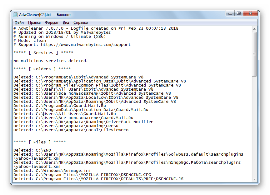- Компьютер перезагрузится, а после его включения все нежелательные приложения, включая «Казино Вулкан», будут удалены. Кроме того, автоматически запустится «Блокнот», в котором в текстовой форме будет содержаться отчет по чистке компьютера утилитой AdwCleaner.