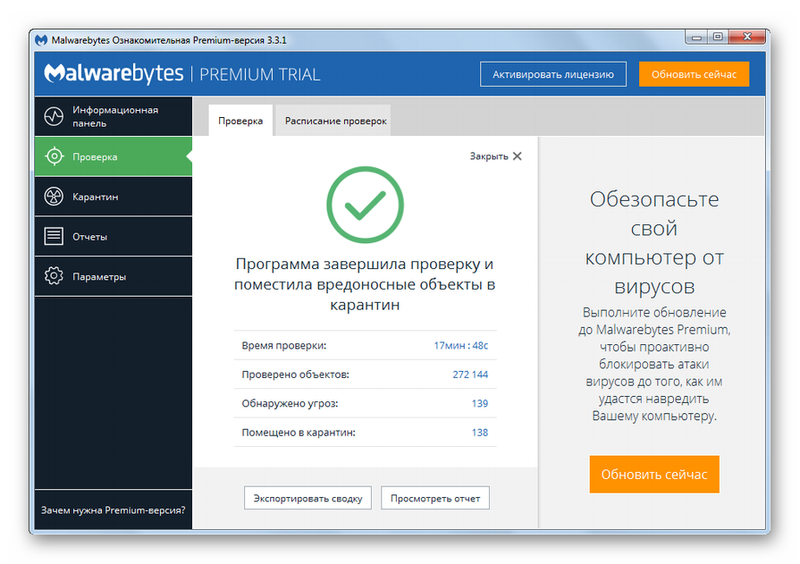 После завершения сканирования вы получите сводную информацию о найденных вредоносных программах. Проверьте список обнаружений, чтобы случайно не удалить легитимные программы и быть уверенным в том, что были удалены именно вредоносные программы. Затем перезагрузите ПК и проверьте его работу и быстродействие. Попробуйте открыть браузер или любую другую программу, с которой у вас ранее были проблемы. Если ваш компьютер стал работать хорошо, значит, скорее всего, он теперь свободен от вирусов.