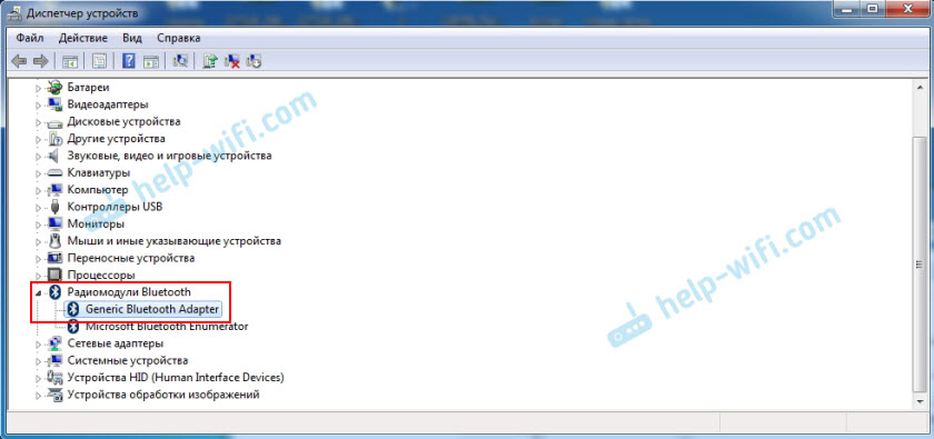 В диспетчере устройств у меня сразу появился раздел «Bluetooth» и сам адаптер. Если адаптер не будет опознан и будет отображаться как неизвестное устройство (другое устройство), то придется ставить драйвера вручную. Как это делать на примере Windows 7, можете посмотреть в конце этой статьи.