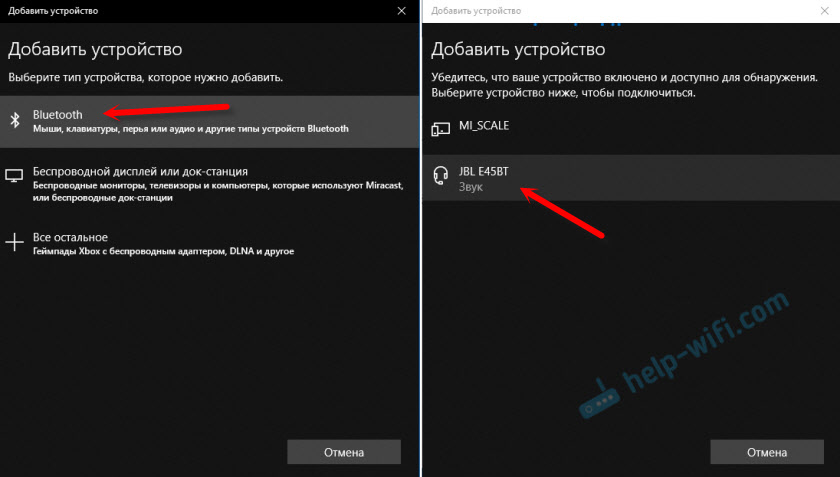 Дальше выбираем «Bluetooth». Компьютер начнет искать доступные для подключения устройства. Наше устройство должно быть в режиме поиска. В моем случае, это наушники. Там есть отдельная кнопка. Когда они в режиме подключения, то на них мигает индикатор. Когда компьютер обнаружит наше устройство, просто выбираем его и подключаемся.