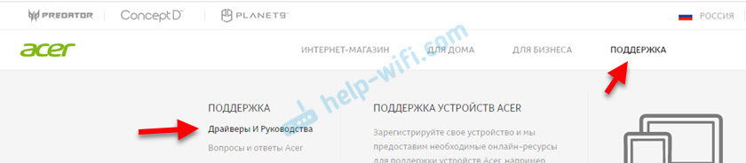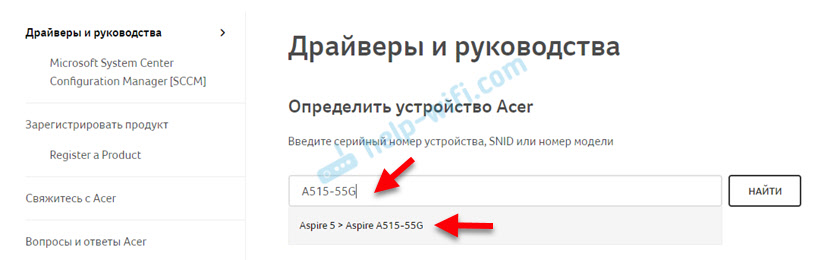 Вернемся к нашему примеру. Так как ноутбук у нас Acer Aspire 5 A515-55G, то заходим на сайт Acer. Находим там раздел с загрузками.