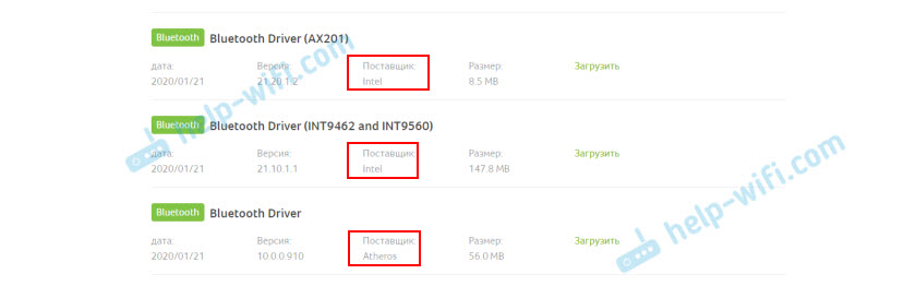 Если на сайте несколько драйверов на Bluetooth, то они для разных поставщиков (производителей) самого модуля. В описании драйвера это указано (Intel, Qualcomm Atheros, Broadcom). Если не знаете какого производителя у вас беспроводной модуль, то можно попробовать скачать и установить оба драйвера. Конечно, это делать нежелательно, но ничего страшного случиться не должно. Как правило, неподходящий драйвер установлен не будет. В процессе установки появится ошибка «устройство не найдено или отключено», или что-то тип этого.
