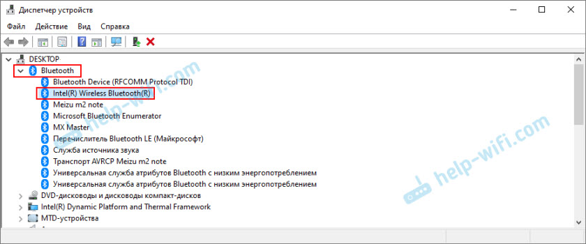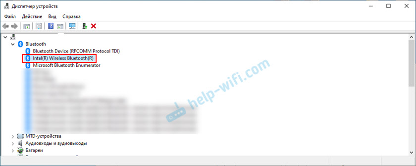 Там должна быть вкладка «Bluetooth», или «Радиомодули Bluetooth». В этом разделе должен быть Bluetooth адаптер. В зависимости от модели и установленного драйвера имя может быть разным. В Windows 10: