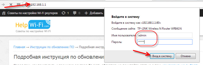 - В браузере в строку поиска ввести 192.168.1.1, а затем данные авторизации.