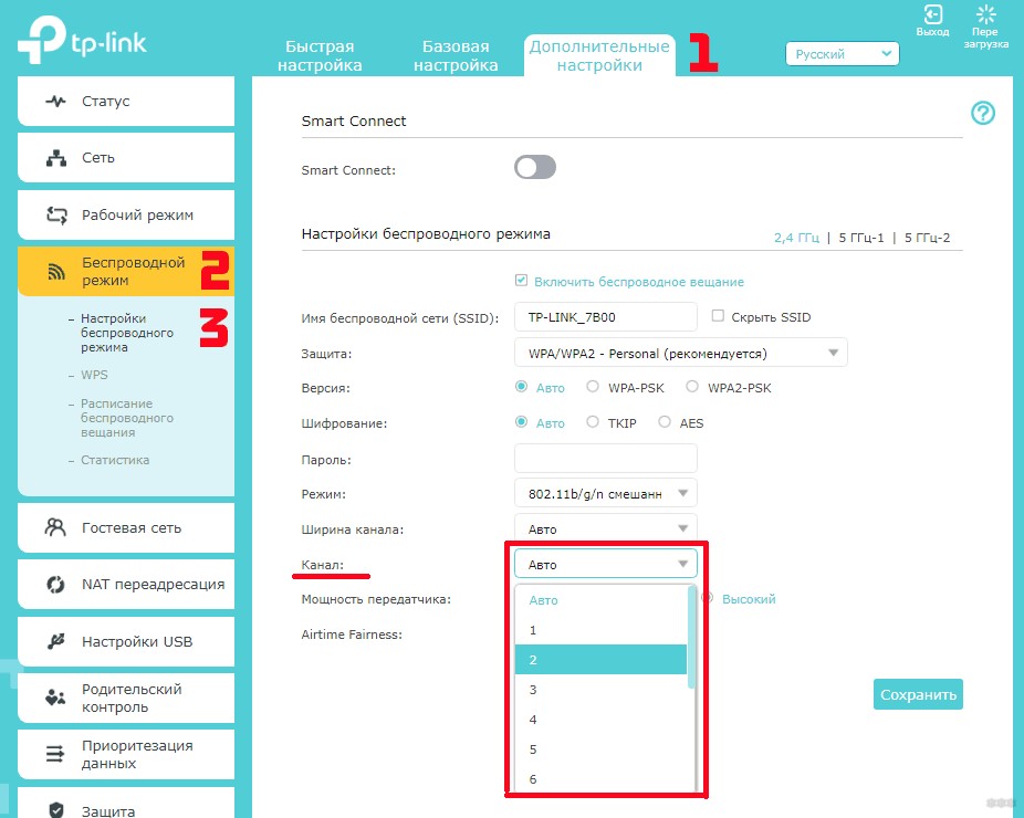 - Выбор канала. Если у вас в доме большое количество беспроводных сетей, они могут создавать помехи друг другу. Попробуйте вручную задать канал (по умолчанию в настройках стоит «Авто»). Попробуйте разные варианты и найдите канал с наименьшей загруженностью.