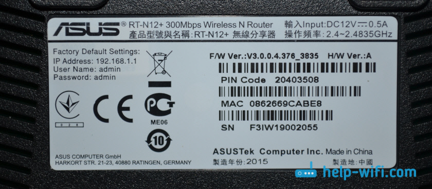 Обратите внимание, что на роутерах ASUS пароль будет подписан как «PIN Code». А сеть скорее всего будет называться «ASUS»