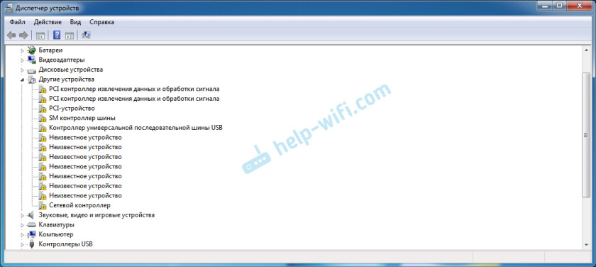 Самый популярный случай – это когда не установлены драйверы. В таком случае, в диспетчере устройств должны быть неизвестные (другие) устройства. Выглядят они примерно вот так:
