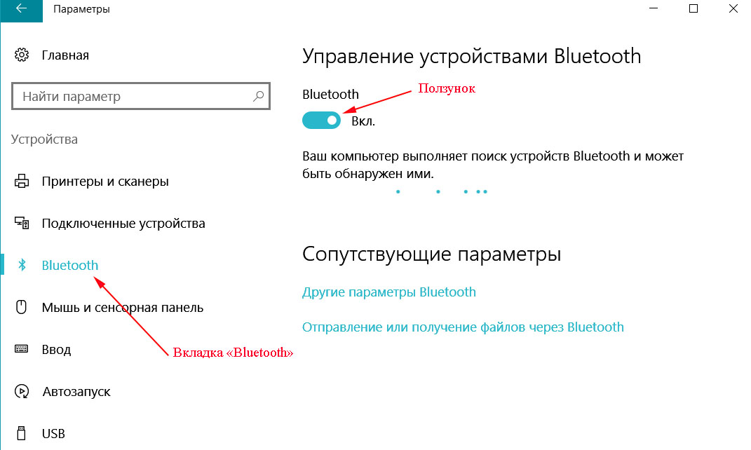 Набор необходимых действий прост: «Пуск-Параметры-Устройства- Bluetooth». В открывшемся окне можно активировать передачу данных по блютузу, а также отслеживать список видимых и сопряженных устройств.