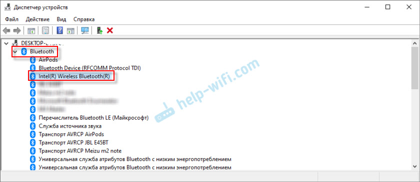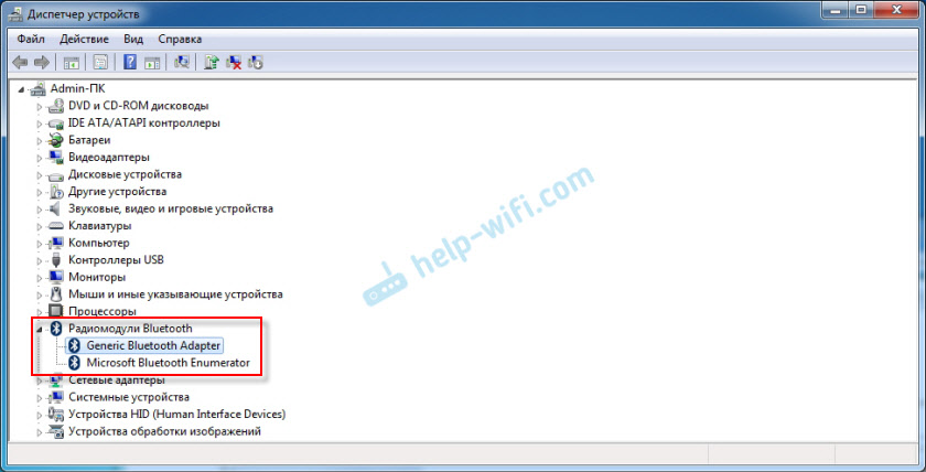 В диспетчере устройств нас интересует вкладка «Bluetooth». В Windows 7 она называется «Радиомодули Bluetooth». Если такая вкладка есть, значит данный модуль установлен и должен работать. Откройте эту вкладку и посмотрите, есть ли там сам адаптер. Выглядит он примерно вот так (в Windows 10):