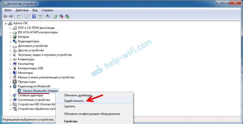 Используется путь «Пуск-Диспетчер устройств-Радиомодули Bluetooth». Он приведет к списку радиомодулей, у большинства ноутбуков он только один. Радиомодуль необходимо активировать для работы с передачей информации. Эта же последовательность действий подойдет и для системы Windows Vista.