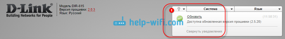 После входа в настройки роутера D-Link, вы сразу можете видеть сообщение о том, что есть новая версия прошивки.