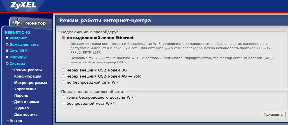 Настройка роутера ZyXEL для работы в сетях 3G и 4G очень проста. В разделе «Система» — «Режим работы» необходимо выбрать соответствующий режим работы: