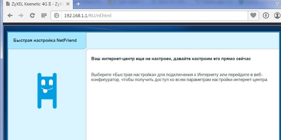 Для настройки Zyxel Keenetic Giga нужно соединить его с вашим компьютером посредством LAN -кабеля, подключённого к сетевой плате ПК и любому из абонентских портов коммутатора. В браузере должен открыться интерфейс управления Кинетик Гига, стартовая страница которого — быстрая настройка. Если ничего подобного не происходит, введите вручную в адресной строке my.keenetic.net или IP-адрес 192.168.1.1, после чего появится стартовая страница.