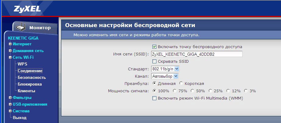 А нажав на «Веб-конфигуратор», вы попадёте на веб-интерфейс Гига для более тонкой настройки. Полностью русифицированное меню управления Keenetic Giga структурировано в виде дерева подразделов, так что найти нужные функции будет несложно. Настройка точки доступа Wi-Fi , например, выполняется в разделе «Сеть Wi-Fi». Здесь можно включить точку доступа, назначить SSID (имя сети), выбрать стандарт и номер канала вещания, настроить безопасность и остальные параметры, необходимые для беспроводных подключений.